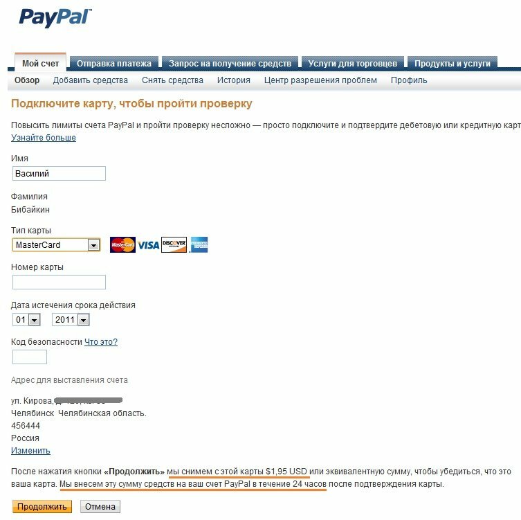 После успешного заполнения формы на ваш сотовый придет смс с кодом подтверждения, который необходимо будет вставить на странице вашего счета PayPal. Для нетерпеливых и нежелающих ждать сутки (а на практике и до трех суток) можно порекомендовать закидывать на карточку сразу на 1,95 $ больше, чтобы денег хватило на запланированную покупку. Идем далее>>